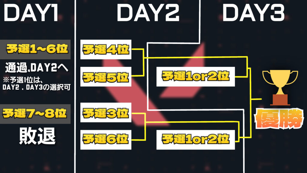 8チームが「スイスドロー形式」で予選を行う。対戦チームの組み合わせは抽選で決まる。この日の上位6チームがDAY2に進出する。また、予選1位のチームはDAY2,DAY3のどちらに進出するかを選択することができる。(2位のチームは1位のチームが選ばなかった日に進出)