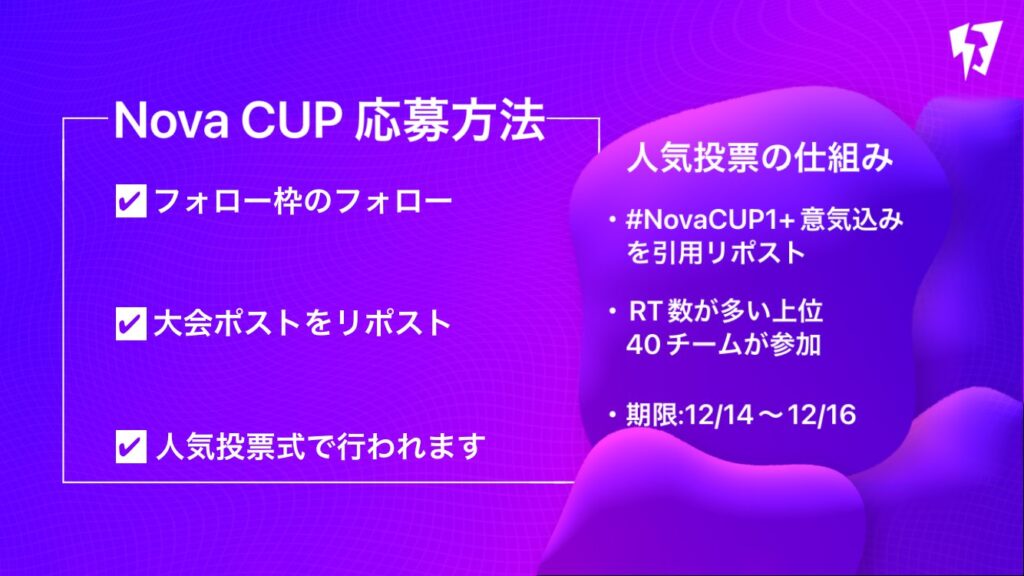 ▫︎ #NovaCUP1 と意気込みを記入して引用リポストをしていただきRTの数が多かった方が参加
