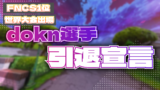 Dokn:C2S8FNCS優勝, C2S7FNCS2位といったかなりの実績を残している猛者。中でも『Gamers8 2022』の出場はとても話題になった。Maufin選手を相方に、世界最大級のe-sports大会で戦った。2023年10月28日に電撃で引退宣言をX上で発表し、競技シーンを後にした。