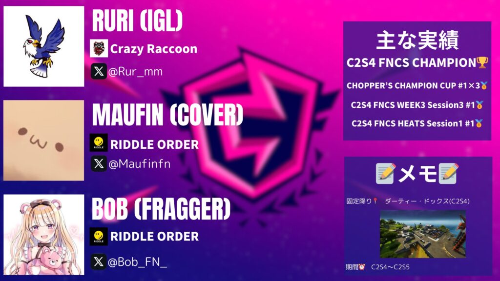 彼らはチャプター2シーズン4からシーズン5にかけて活躍した伝説的トリオだ。当時のFNCSで覇権を握っていた。大会で強力なパフォーマンスを発揮しており、アジアサーバーの競技のレベルを引き上げたトリオだとも言えるだろう。個々の技術に加え、チームのコミュニケーションと戦略が、彼らを成功へと導いている。