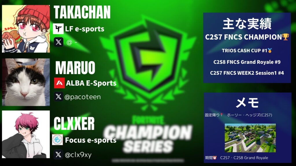 彼らはチャプター2シーズン5からシーズン8にかけて活躍したトリオ。競技シーンを引退した選手もいるが、今でも名前を轟かせ続けている。
