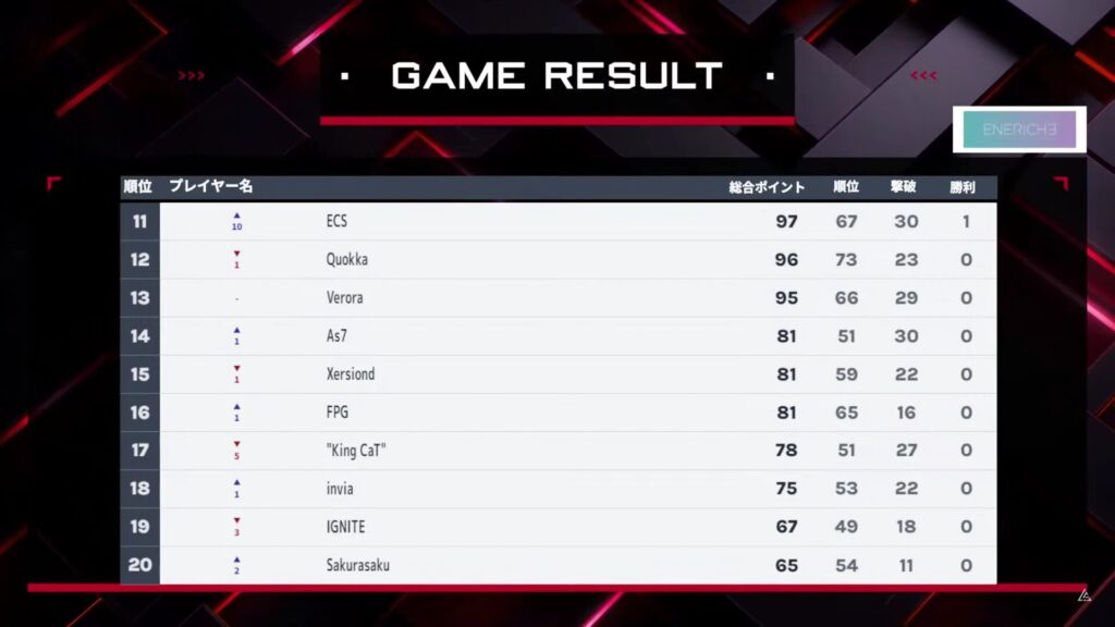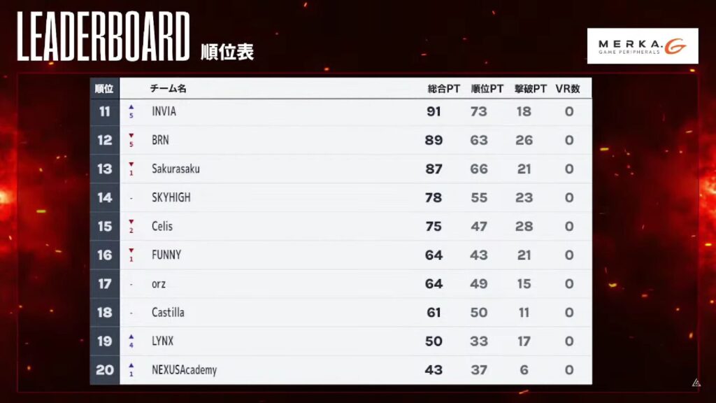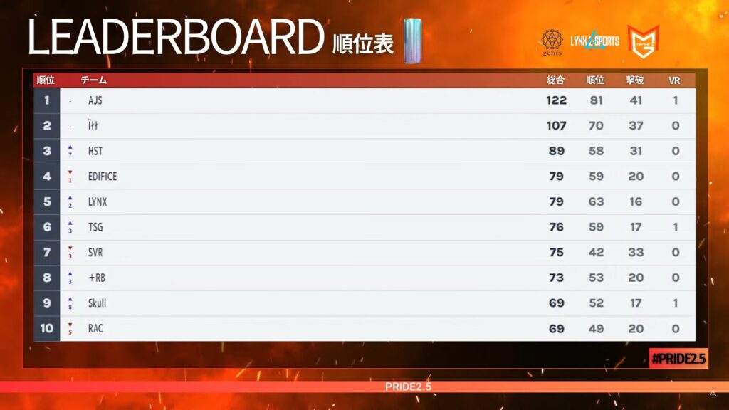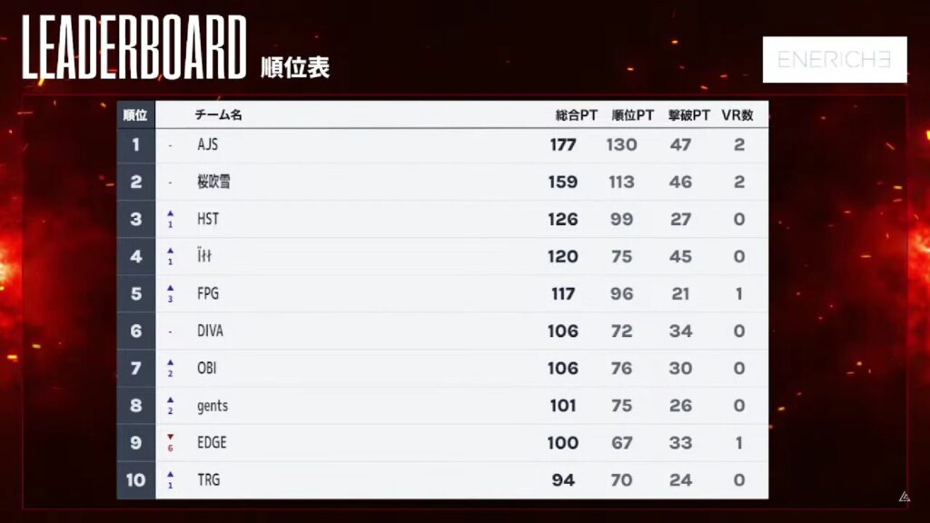 | 順位 | チーム名 | 総合ポイント | 順位ポイント | 撃破ポイント | 勝利回数 |