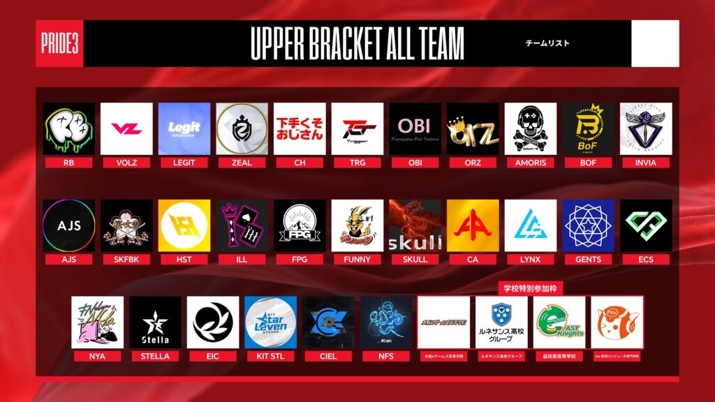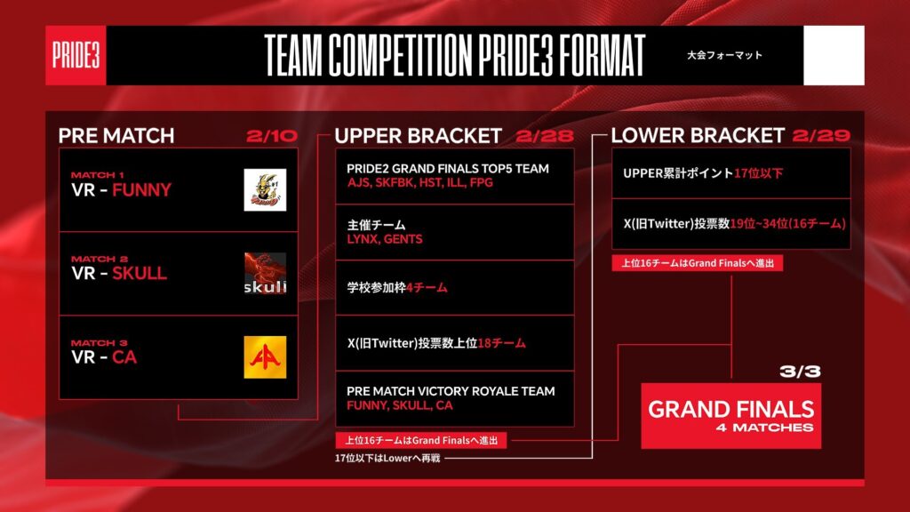 「PRIDE」は、フォートナイトのe-sportsチーム同士が戦う賞金付きの大型大会である。過去には「AJS」,「UW」,「IGNITE」などの強豪や、有名選手が参戦した。